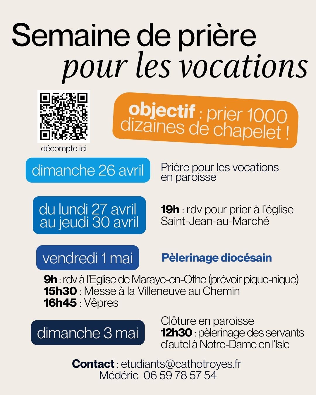 La semaine est marquée par le défi des 1000 dizaines. Programme : 12h30 : Accueil à Notre Dame en Isle avec le pique-nique. 14h : Louange et chant. 14h30 : Atelier de 15 min. Atelier figure de Sainteté. Témoignage et temps de prière. Qu’est-ce qu'une mitre et une crosse, l'anneau d’évêque, la croix pectorale. Défi […]